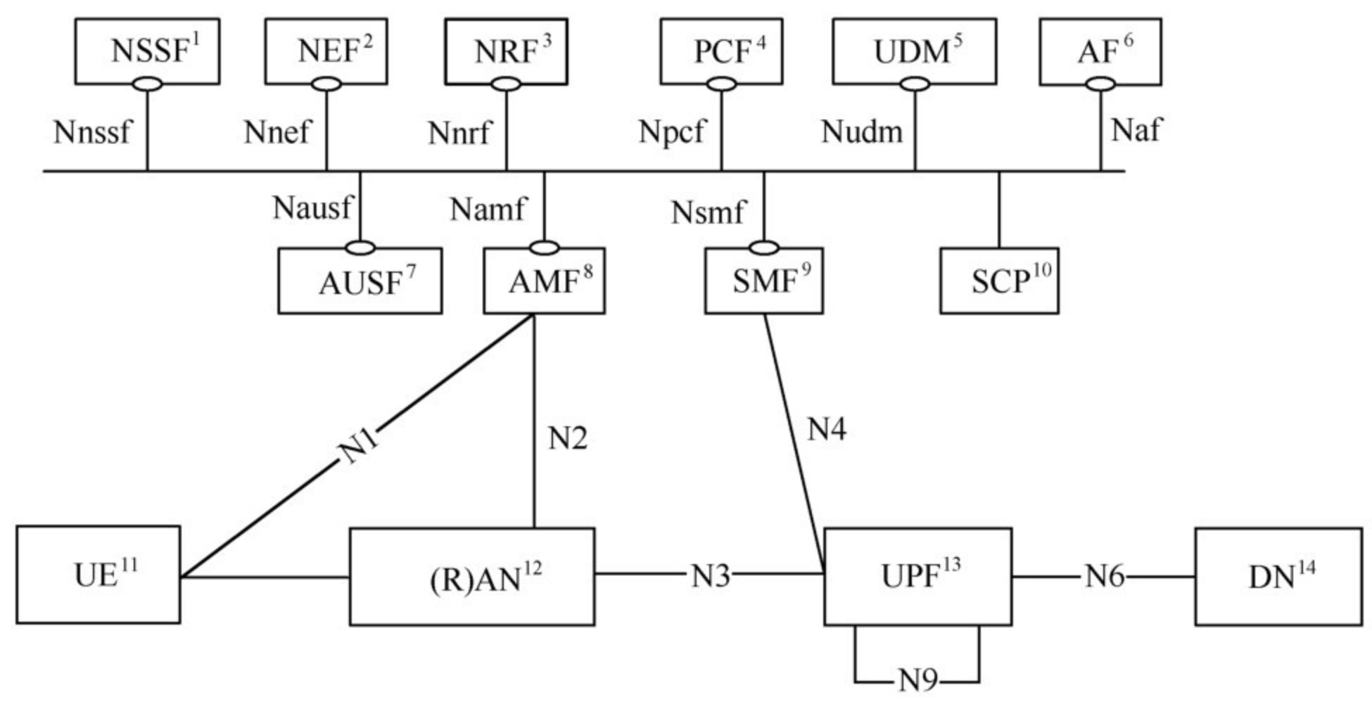 例如:AMF(接入和移动管理功能)、SMF(会话管理功能)、UPF(用户面作用)等。