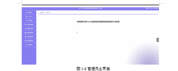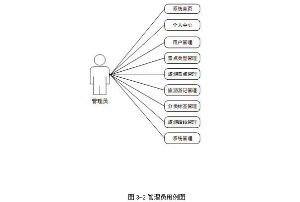 管理员进入系统主页面,核心能力包括对系统首页、个人中心、用户管理、景点类型管理、旅游景点管理、旅游游记管理、分类标签管理、旅游路线管理、系统管理等进行操作。如图5-8所示:
