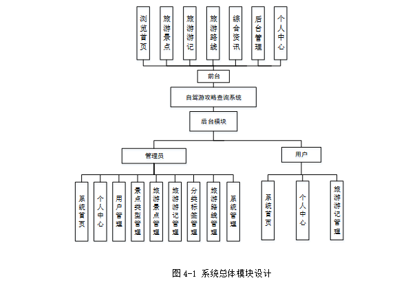自驾游攻略查询系统根据权限类型进行分类,主要可分为用户和管理员二大模块。用户模块首要实现了修改个人信息,查看旅游景点、旅游游记、旅游路线等执行,加强了用户的操控体验。管理员模块主要根据管理员对整个系统的管理进行设计,提高了管理的效率和规范[11]。体系总体模块设计如下图所示: