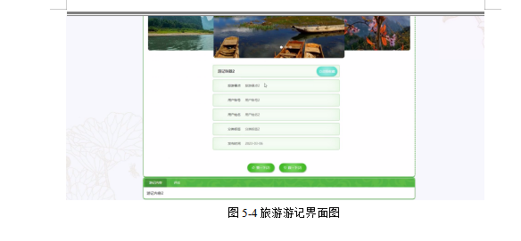 用户点击旅游游记,在旅游游记页面的搜索栏输入游记标题,进行查询,接着能够查看游记标题、封面图片、旅游景点、用户账号、用户姓名、分类标签、发布时间等信息,还可以点击收藏或者评论等操作,如图5-4所示。