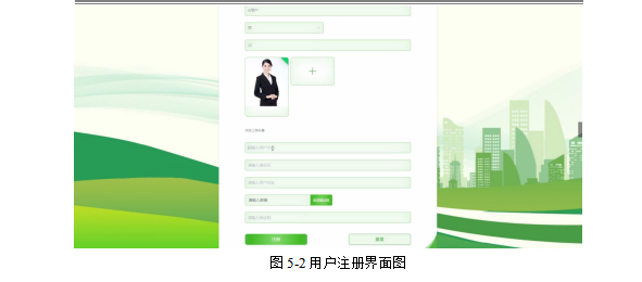 当用户进入前台系统进行相关操作前必须先注册登录,在注册页面填写用户账号、密码、确认密码、用户姓名、性别、年龄、头像、用户手机、身份证、用户住址、邮箱等信息,然后点击注册,如图5-2所示。
