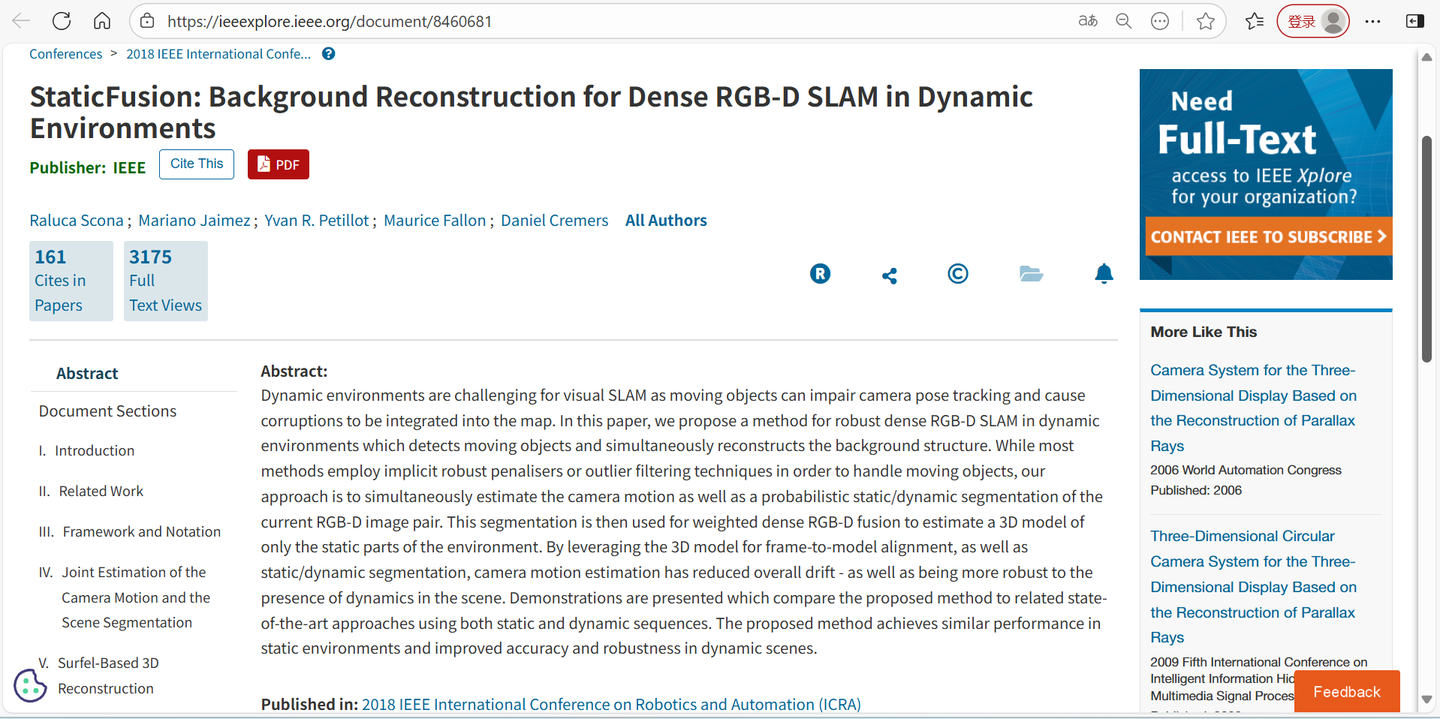 参考StaticFusion,思路是同时估计相机运动以及当前RGB-D图像对的概率性静态/动态分割。随后,该分割被用于加权的稠密RGB-D融合,以仅估计环境静态部分的3D模型。通过利用3D模型进行帧到模型的配准,并结合静态/动态分割,相机运动估计减少了整体漂移,并且对场景中动态物体的存在具有更强的鲁棒性。
