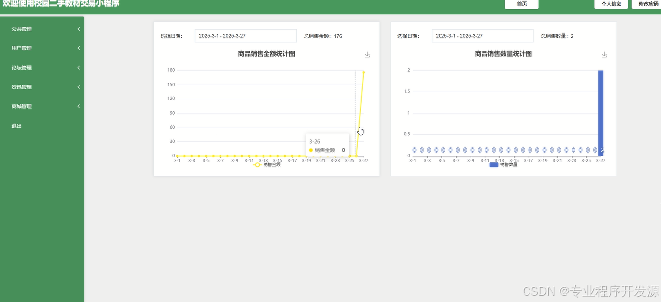 在资讯管理和商城管理模块的测试中,系统资讯的发布、分类管理,以及二手交易订单的查看和配送管理均符合预期,确保了平台的信息流畅性和交易的顺利进行。整个体系的各项功能在测试过程中表现稳定,未发现影响首要功能的 Bug,平台响应速度良好,用户体验流畅。综上所述,系统已达到预期设计目标,具备较高的稳定性和可靠性,能够满足校园二手交易的实际需求,适用于正式上线推广。后续可根据用户反馈优化细节,以进一步提升环境的易用性和用户体验。