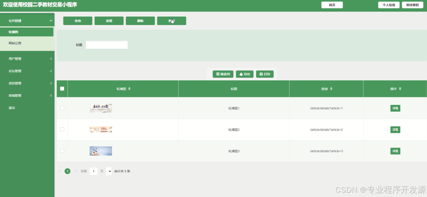 系统管理中的轮播图管理功能允许管理员上传和更改首页的轮播图。管理员行设置图片的展示顺序和链接,确保首页信息的及时更新和广告内容的管用推广,从而提升平台的用户吸引力。界面如下图所示。
