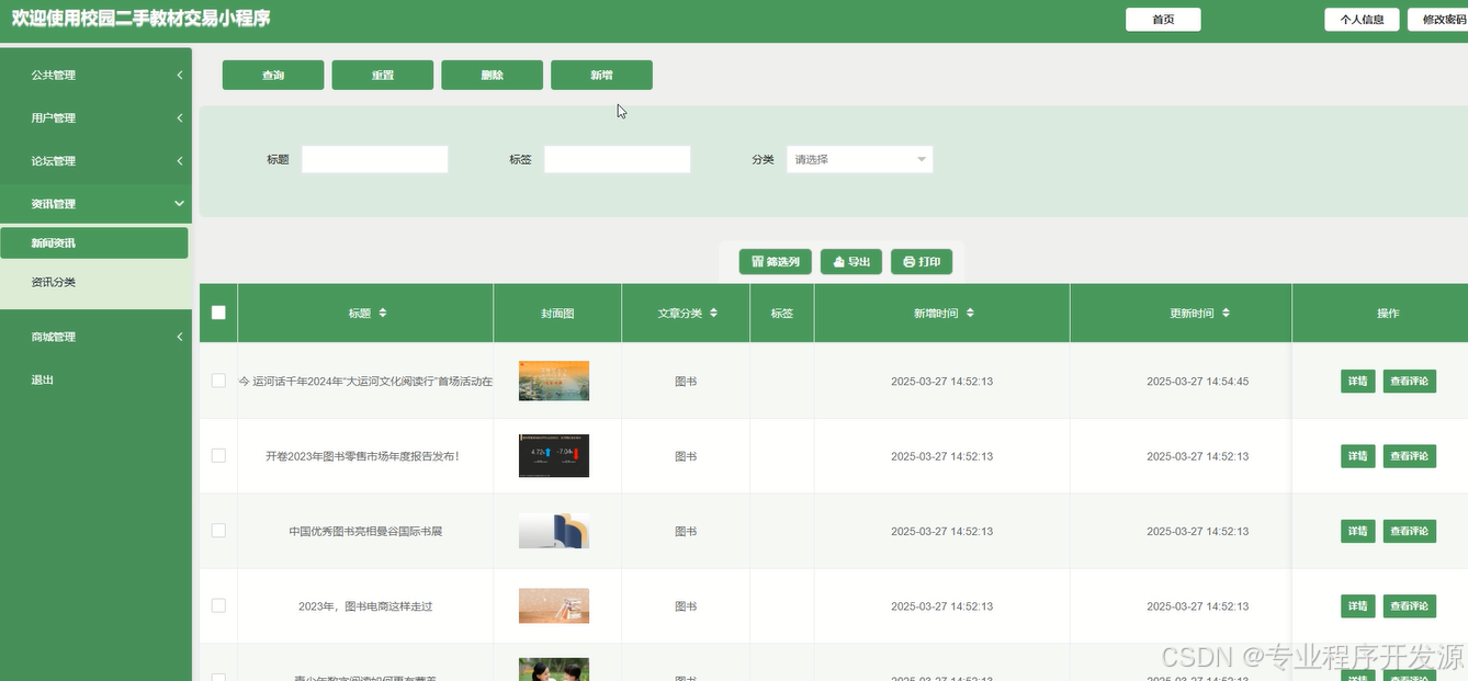 资讯管理功能允许管理员管理新闻资讯和资讯分类。管理员可以添加新的资讯内容、修改已有内容,并根据主题将资讯分门别类,确保资讯的组织清晰、易于查找,并满足学生对校园动态的需求。界面如下图所示。
