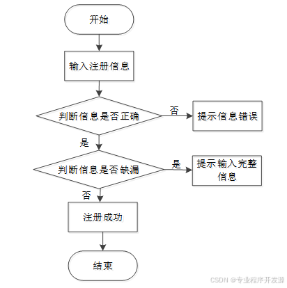未有账号的用户可进入注册界面进行注册操作,填写注册表格,包括用户名、密码、电子邮件等必要信息。后台系统验证并保存用户提交的信息。分配唯一用户标识符。注册成功后,用户可以运用账号密码进行登录。用户注册流程图如下图所示。