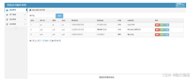 点击医生管理菜单,表现添加医生信息和医生信息列表界面,点击添加医生信息,右侧界面呈现出添加的医生信息界面,包括医生医生编号,用户名,密码,姓名,联系电话,联系地址,科室,从业经历等信息,添加医生信息完毕点击“提交”按钮,则添加医生信息成功。点击“医生列表”,右侧界面呈现出应该医生的具体信息,包括医生编号,用户名,密码,姓名,联系电话,联系地址,科室,从业经历等信息,可对逐条医生信息进行查看、删除和修改