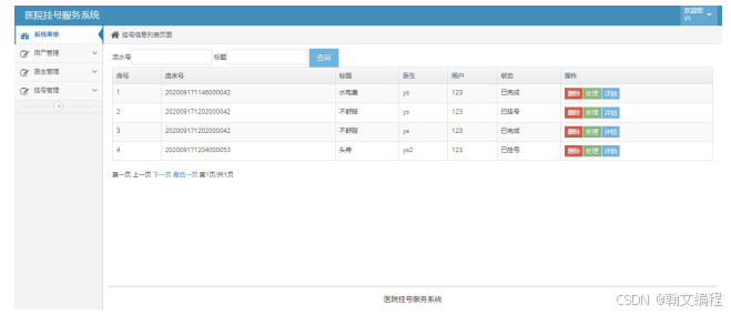 3 挂号( 挂号编号,流水号,标题,内容,医生,说明,用户,状态,医疗信息,建议 )