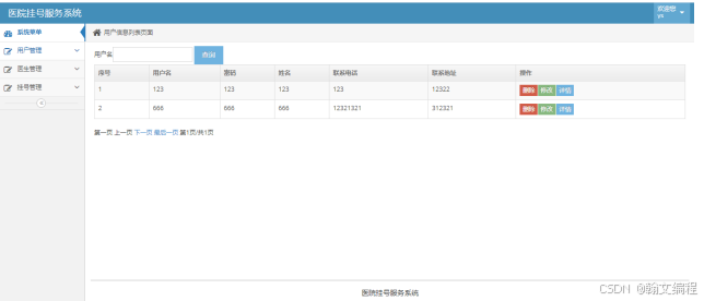 点击用户管理菜单,显示添加用户信息和用户信息列表界面,点击添加用户信息,右侧界面呈现出添加的用户信息界面,包括用户用户编号,用户名,密码,姓名,联系电话,联系地址等信息,添加用户信息完毕点击“提交”按钮,则添加用户信息成功。点击“用户列表”,右侧界面呈现出需要用户的具体信息,包括用户编号,用户名,密码,姓名,联系电话,联系地址等信息,可对逐条用户信息进行查看、删除和修改
