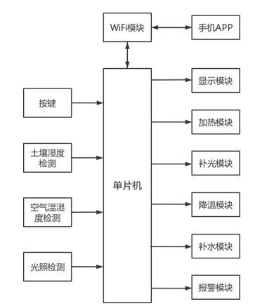 智能蔬菜大棚环境远程监控系统关键由STM32单片机控制器、土壤湿度检测模块、光照检测模块、空气温湿度检测模块、液晶显示模块和WiFi通信模块构成。在功能上有自动和手动两种模式,在自动模式下,根据检测到的环境参数自动进行调控,若土壤湿度过低,则自动进行补水;若空气温度过低,则驱动加热模块自动加热;若温度过高,则排风扇工作自动进行通风降温;若光照太低,则补光灯工作自动进行补光。通过在手动模式下,则可以根据手动命令完成加热、排风、浇水和补光灯控制操作,并且能够通过手机APP进行远程控制。根据实际需求在手机APP上设置阈值,系统根据设定阈值进行自动调控,系统总体架构如图2.1所示。