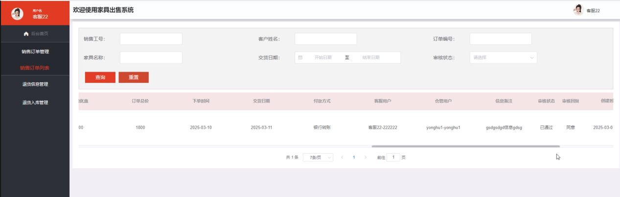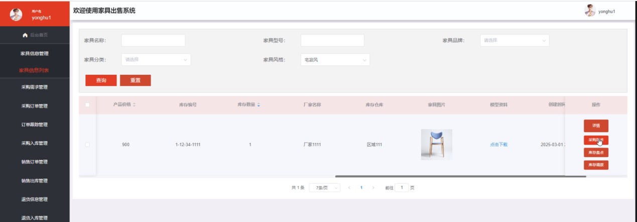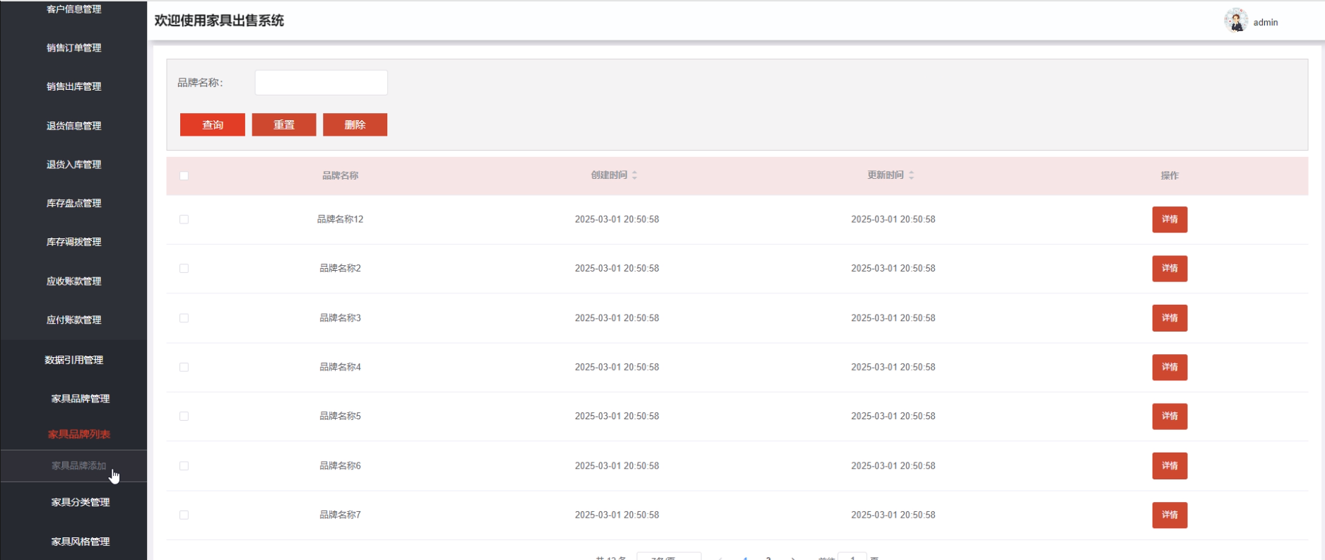 In the current context, furniture companies are facing complex supply chain management and customer service demands. The traditional management model often relies on manual operations and paper records, which is not only inefficient but also prone to errors, making it difficult to meet the requirements of modern enterprises for refined management and rapid response to market changes. Therefore, building a digital management system that integrates the latest technology is particularly important. Therefore, this article proposes a furniture sales system developed based on Spring Boot and Vue framework. The system aims to provide a comprehensive, efficient, and easy-to-use management platform for furniture enterprises by integrating advanced information technology, covering the entire process of business needs from supplier information management to sales and outbound management.