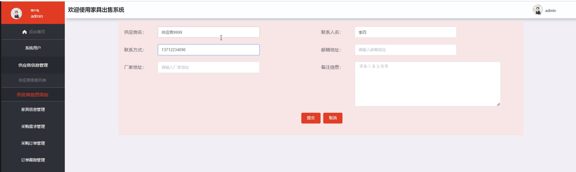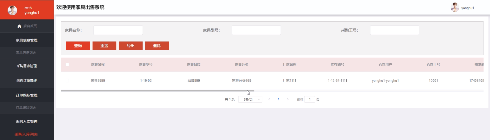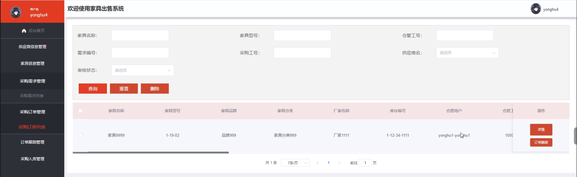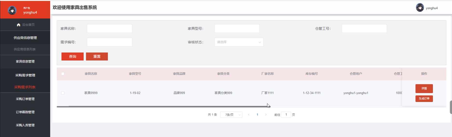 采购用户登录后,可以查看供应商信息、家具信息、采购需求、采购订单等信息并进行相关操作;同时许可查看或修改个人主要信息和登录密码。