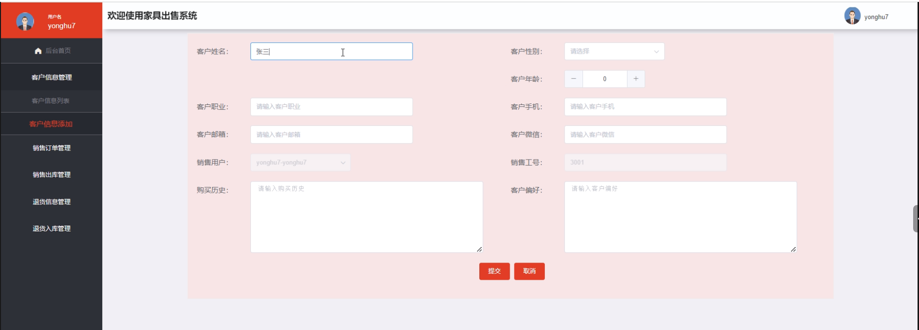 在该模块用户可以对客户信息列表进行管理和进行客户信息添加。如点击“家具信息添加”进入页面填写客户名称、客户性别等信息后点击“提交”即可完成客户信息的添加,添加后需由管理员进行审核。以客户信息添加为例,其界面如图5-15所示。
