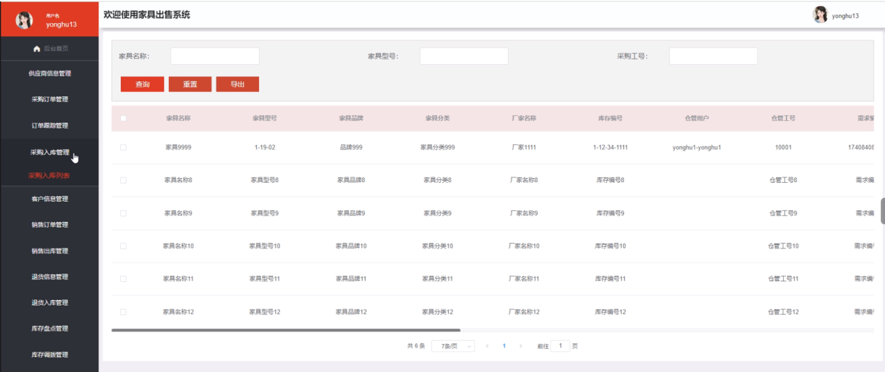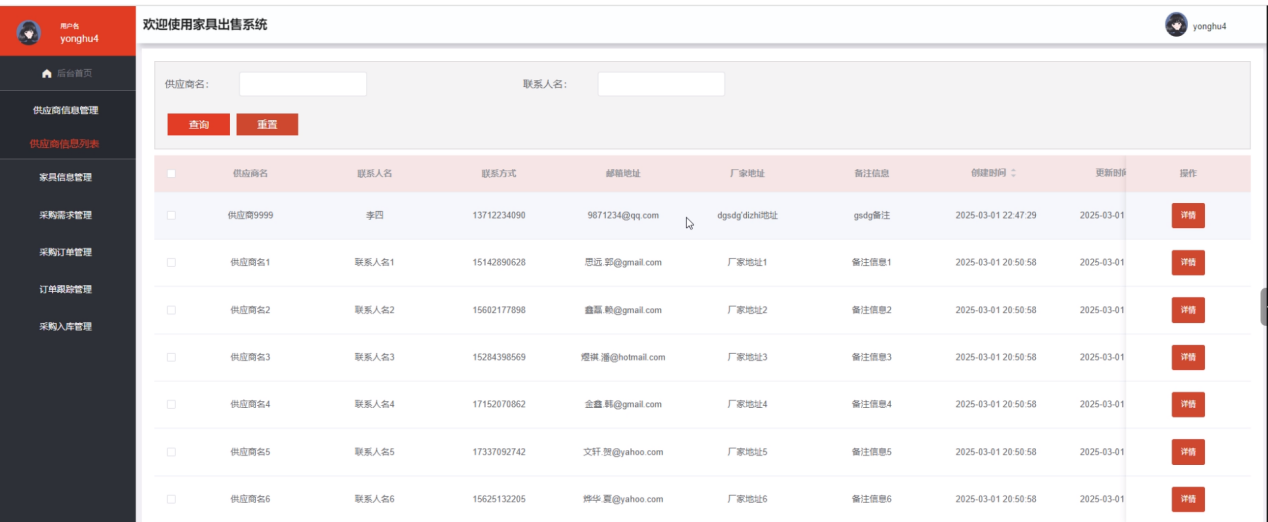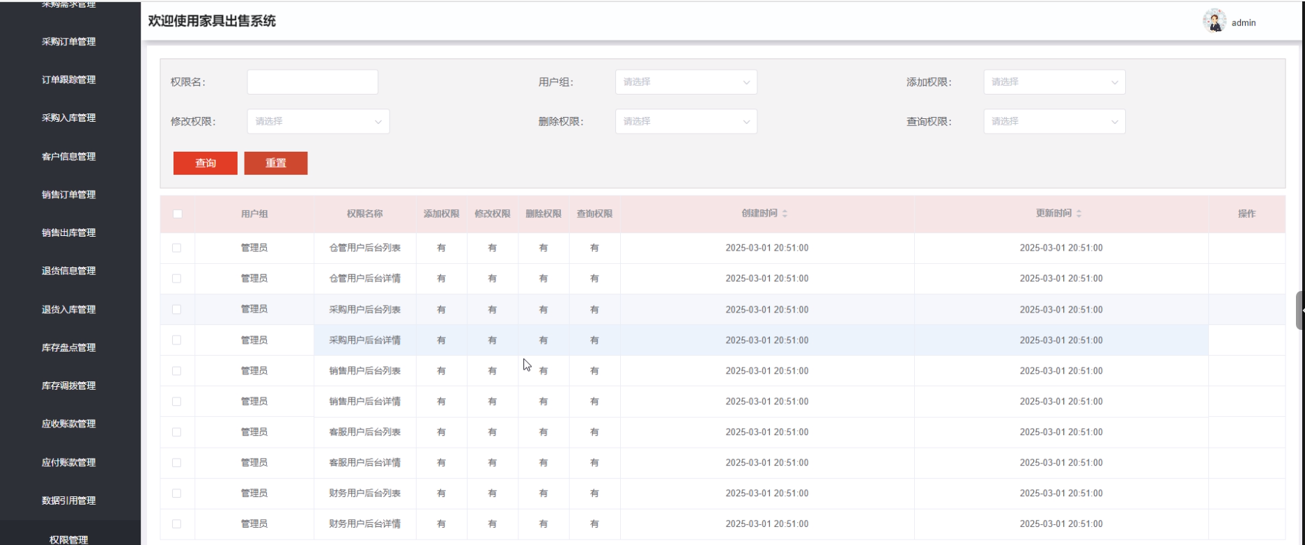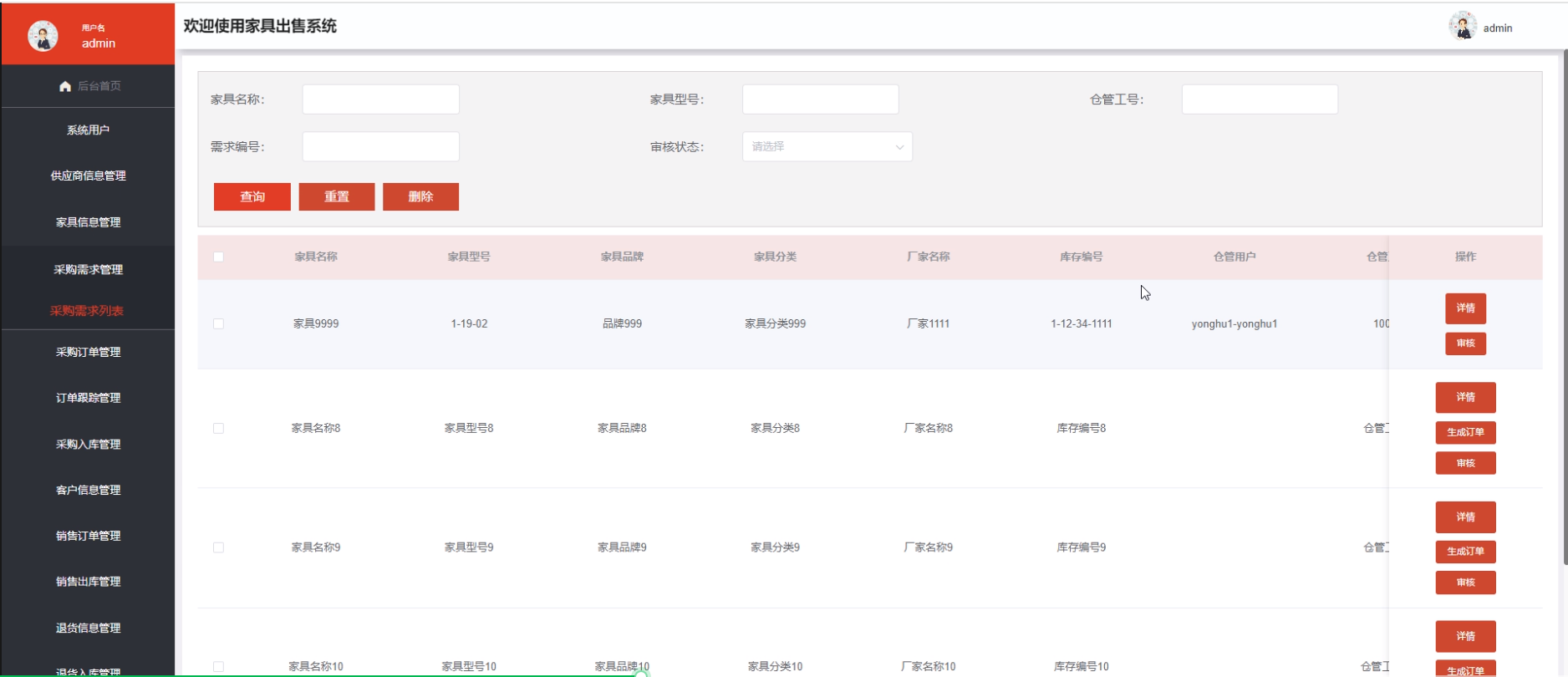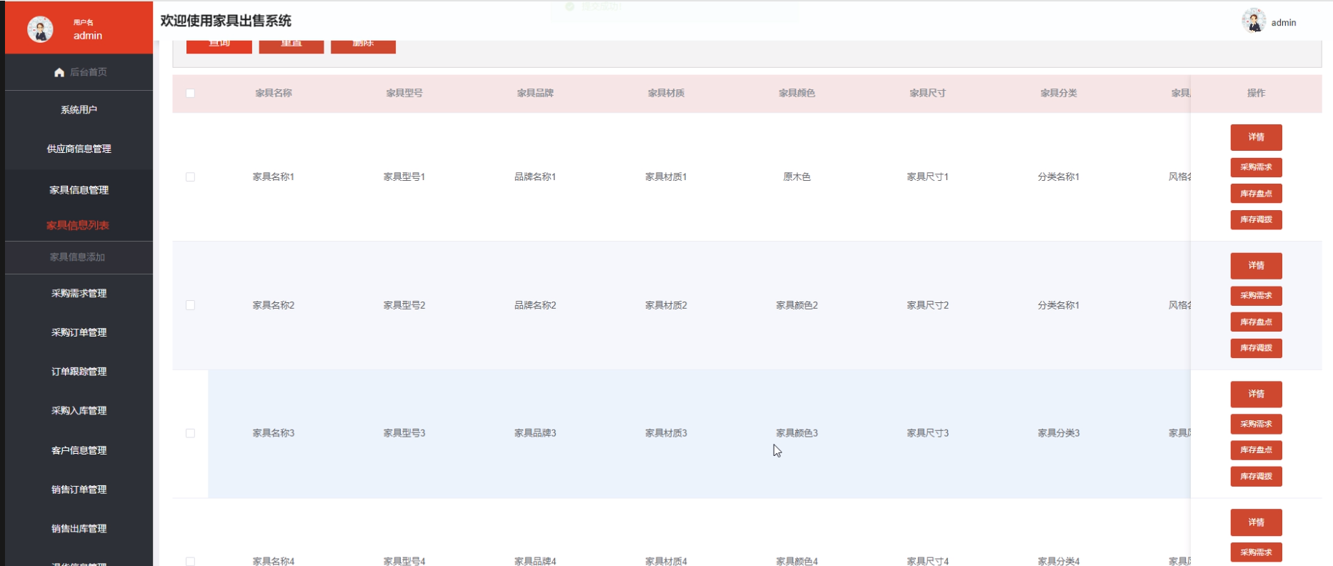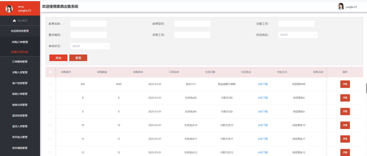 The content of this furniture sales system covers multiple core modules, including but not limited to supplier information management, purchase order processing, inventory control, customer relationship management, and financial account management. The system design focuses on differentiated management of user roles, ensuring that different types of users (such as administrators, warehouse managers, purchasers, salespeople, and customer service personnel) can perform corresponding operations according to their respective permissions. For example, administrators are responsible for global settings and data management; The warehouse keeper focuses on inventory related affairs; The purchaser handles suppliers and purchase orders; Salespeople focus on customer information and service quality. In addition, the system also supports detailed data analysis functions to provide decision support for enterprise management.