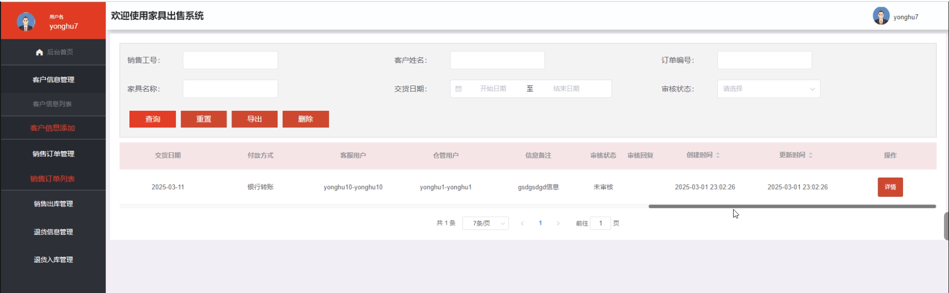 用户可以查看销售订单列表中某个销售订单的信息详情;可以对列表信息进行查询、重置、导出和删除处理。其界面如图5-16所示。