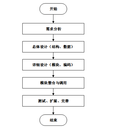 环境创建流程的核心步骤,从需求分析到系统完成的全过程。流程包括需求分析、总体设计(结构、功能、数据)、详细设计(模块、编码)、模块整合与调用,以及测试、扩展和完善,最终做完系统的开发。本系统的开发流程如图3-7所示