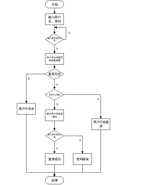 用户输入用户名和密码后,系统先检查输入是否为空,再验证用户名是否存在,若存在则通过用户名获取密码并校验。若密码正确则登录成功,否则提示密码错误。若用户名不存在或无法登录,提示用户管理无效。如图3-8所示。