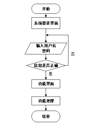 用户首先进入系统登录界面,输入用户名和密码后,系统验证信息是否正确。若验证失败,返回登录界面重新输入;若验证成功,则进入功能界面,执行相应功能处理后结束操作流程。操作流程如图3-9所示。