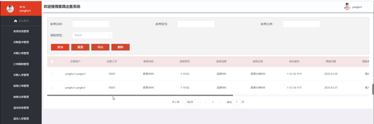 用户可以查看库存调拨列表中某个库存调拨的详情,可以对列表信息进行查询、重置、导出和删除操作。其界面如图5-10所示。