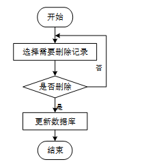 否确认删除。若未确认,返回选择环节;若确认删除,则更新数据库,删除对应记录,结束处理后流程结束。删除信息流程图如图3-12所示。就是用户选择需要删除的记录后,系统判断