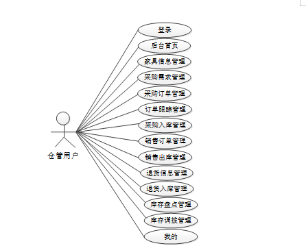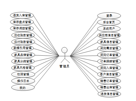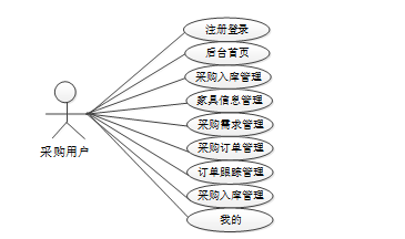 管理员登录环境后,可以对系统用户、供应商信息、家具信息、采购需求、采购订单、订单跟踪、采购入库、客户信息等进行管理。管理员用例图如图3-1所示。