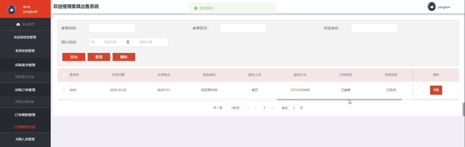 用户可以查看采购订单列表中某个采购订单的详情和下载采购合同,点击“订单跟踪”进入页面填写订单状态、发货状态等信息后点击“提交”即可做完订单跟踪信息的提交。许可对列表信息进行查询、重置和删除操作。其界面如图5-13所示。