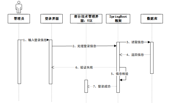 管理员输入登录信息后,登录界面将信息传递至前台管理界面,随后通过SpringBoot框架读取数据库中的用户信息并返回。系统验证信息,若验证成功则登录成功,若验证失败则返回错误提示。登录时序图如图4-3所示。