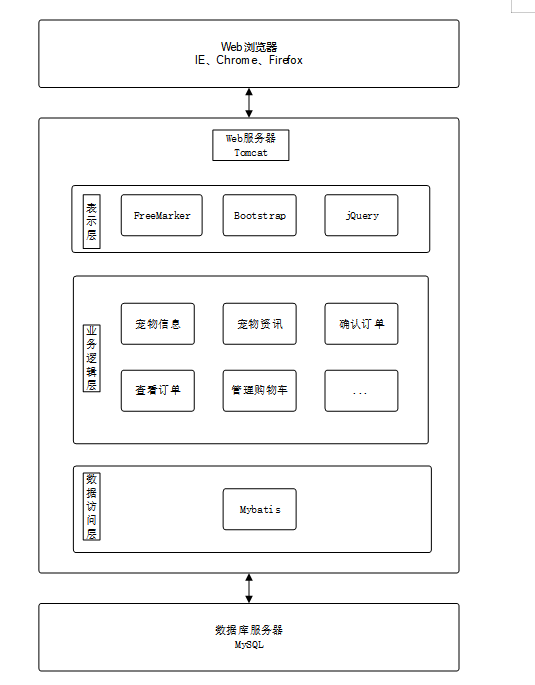系统由表现层、业务逻辑层、数据访问层和数据库服务器组成。表现层通过浏览器(如IE、Chrome、Firefox)与用户交互,采用FreeMarker、Bootstrap、jQuery等技术实现界面呈现。业务逻辑层负责处理系统的核心业务逻辑,经过分模块设计实现功能分离。数据访问层启用MyBatis框架连接数据库,执行素材的增删改查管理。数据库服务器采用MySQL进行数据存储和管理,为系统提供稳定的数据库帮助。整个架构通过Tomcat服务器完成用户请求的接收和处理,确保系统的高效运行[8]。整个系统架构如图4-1所示。