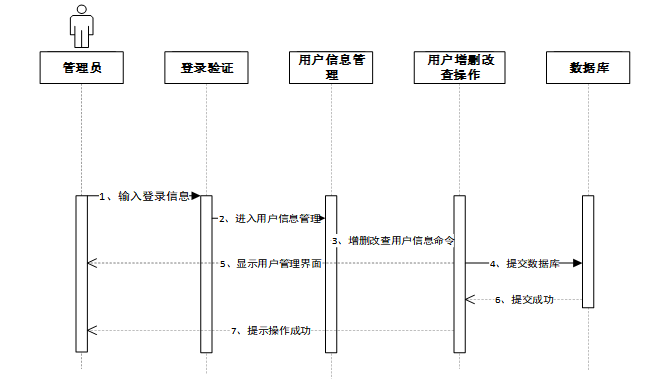 管理员输入登录信息后,进入用户信息管理模块,选择增删改查操作并提交命令至数据库。数据库执行管理后返回成功状态,系统表现用户管理界面并提示操作成功。管理员修改用户信息时序图如图4-4所示。