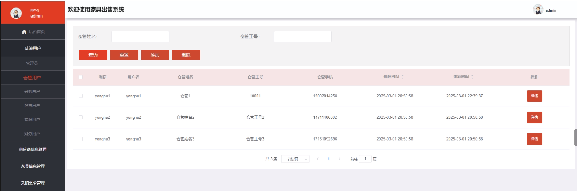 仓管登录后,能够查看家具信息、采购需求、采购订单、订单跟踪、采购入库等信息并进行相关操作,同时可以查看或修改个人基本信息和登录密码。