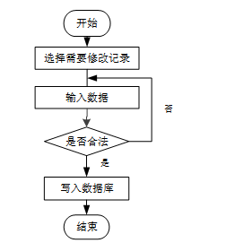用户第一选择需要修改的记录,输入修改后的数据,系统判断输入数据是否合法。若信息不合法,提示重新输入;若数据合法,则将修改后的信息写入数据库,完成操作后流程结束。修改信息流程图如图3-11所示。