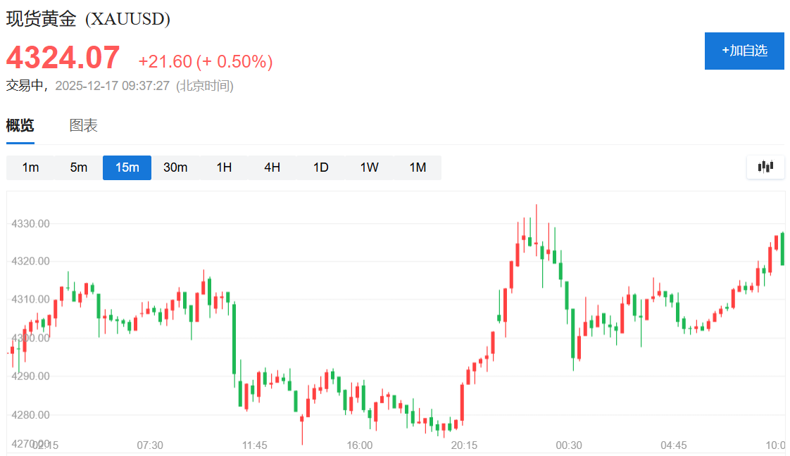 11月非农引发金价高位剧烈震荡,12月17日亚市现货黄金震荡上行,报4324.07美元/盎司,短期守住4300关口。