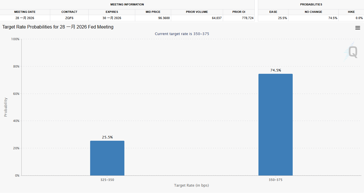 CME Fed Watch显示,1月会议降息概率维持低位约25%,市场预计2026年整体进一步宽松幅度约50-60基点,但短期美联储倾向暂停。