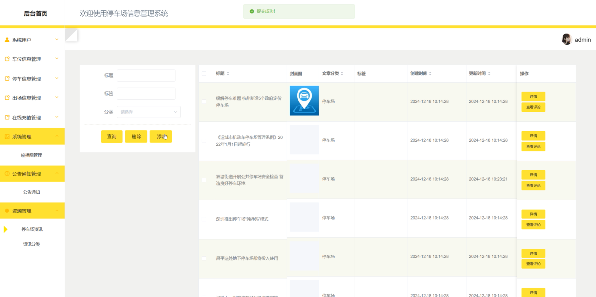 资源管理:发布和管理停车场相关资讯,增强信息传播效果。创建和维护资讯分类,便于用户快速查找相关内容。