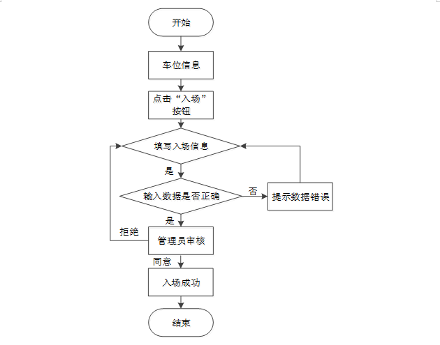 否可用。待管理员审核通过后,系统更新车位状态为“占用”,记录用户的入场时间,并将相关信息写入停车记录表。同时,系统生成临时停车凭证供用户参考,做完整个入场操作。此流程确保了车位资源的合理分配和用户停车记录的准确记录。用户停车入场流程图如下图所示。就是用户停车入场流程从用户选择车位开始,首先利用系统查询空闲车位信息,包括车位编号、地址、价格及状态等。选定车位后,用户发起“入场”请求,系统验证用户身份并检查车位