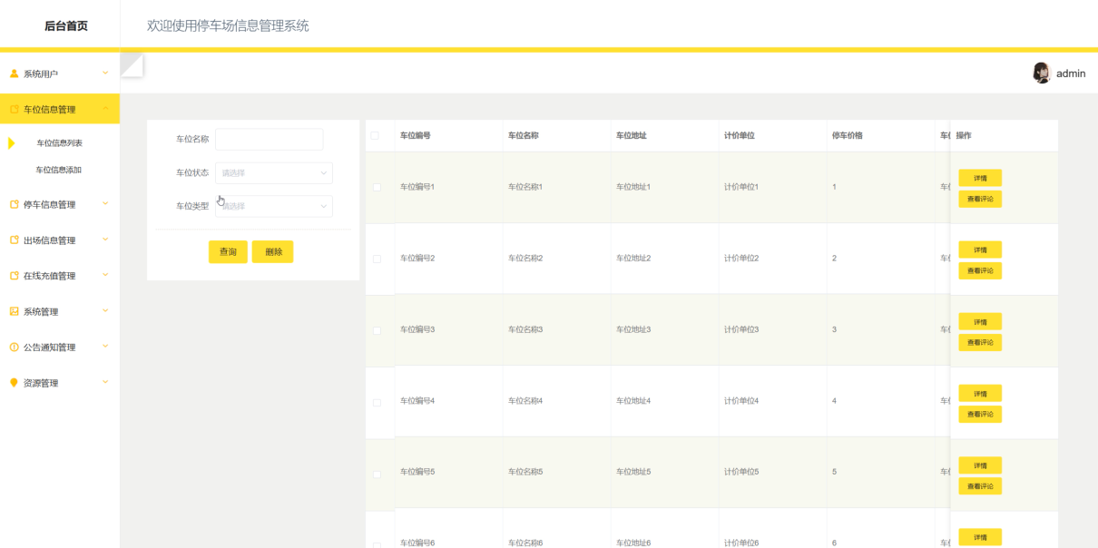 车位信息:查询停车场的空闲车位、价格、位置等详细信息,辅助用户选择合适的车位。
