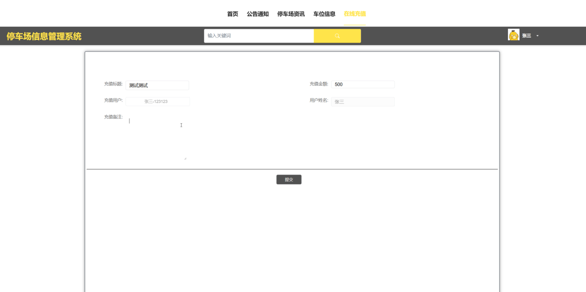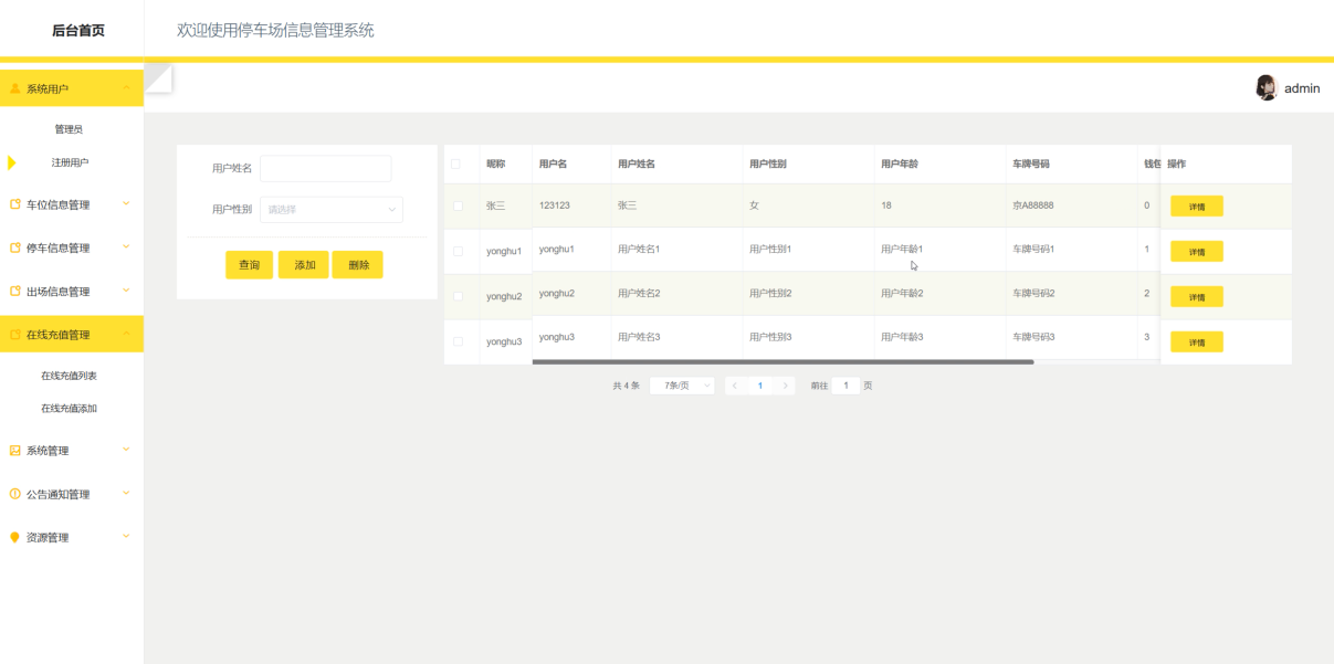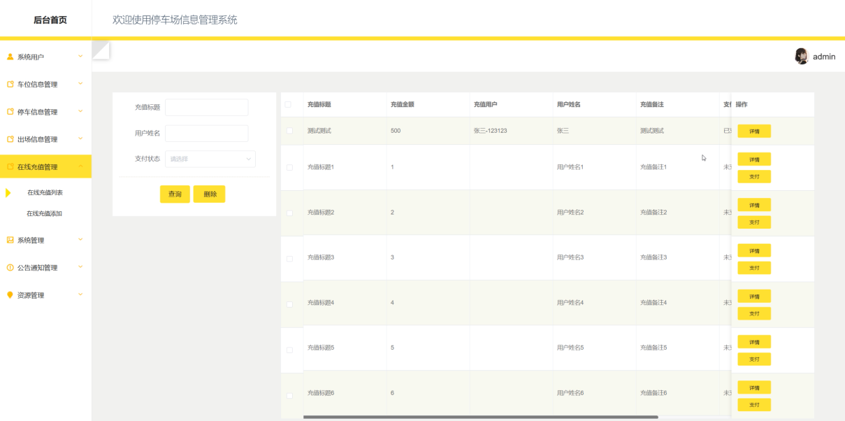 The system uses Spring Boot as the back-end framework, combined with MySQL database for data storage, and uses front-end technology to achieve a user-friendly interactive interface. Functionally, the system is divided into two role modules: registered user and administrator. Registered users can query parking space information, recharge online, and view parking records through the system. The administrator is responsible for parking space management, parking review, announcement and system configuration. The system aims to optimize the management of parking lot resources and improve user experience and service efficiency through information technology.