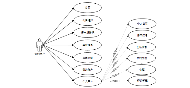 注册用户主导围绕便捷停车和账户管理展开。用户可以通过环境查询车位信息,选择合适的停车位并搞定入场操作;在停车过程中,用户能够实时查看停车记录及费用情况,并通过在线充值效果确保账户余额充足。此外,用户还可以收藏常用停车场、发布评论以及管理个人资料,从而获得更加个性化的服务体验。注册用户用例图如图3-1所示。