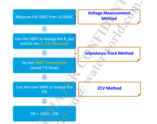 首先通过adc读取电池 Vbat脚的电压值,然后通过这个闭路电压值查找 R—Table (cust_battery_meter_table.h )获得当前电压和温度下的电池内阻值。然后通过递归回溯的方法得到开路电压 OCV,然后通过这个OCV电压值查找 放电深度表获取当前的放电深度。从而算出剩余的电池电量。