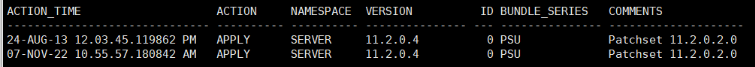SQL> set lin 150 SQL> col action_time for a30 SQL> col action for a10 SQL> col namespace for a10 SQL> col version for a15 SQL> col id for 99 SQL> col bundle_series for a15 SQL> col comments for a20 SQL> select * from dba_registry_history