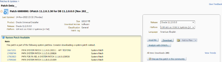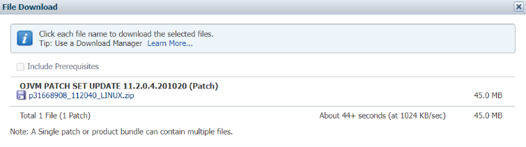 [oracle@server dbhome_1]$ cd /soft/ [oracle@server soft]$ unzip p31668908_112040_LINUX.zip [oracle@server 31668908]$ $ORACLE_HOME/OPatch/opatch prereq CheckConflictAgainstOHWithDetail -ph ./ Oracle Interim Patch Installer version 11.2.0.3.38 Copyright (c) 2022, Oracle Corporation. All rights reserved. PREREQ session Oracle Home : /u01/app/oracle/product/11.2.0/dbhome_1 Central Inventory : /u01/app/oraInventory from : /u01/app/oracle/product/11.2.0/dbhome_1/oraInst.loc OPatch version : 11.2.0.3.38 OUI version : 11.2.0.4.0 Log file location : /u01/app/oracle/product/11.2.0/dbhome_1/cfgtoollogs/opatch/opatch2022-11-16_15-14-53PM_1.log Invoking prereq "checkconflictagainstohwithdetail" Prereq "checkConflictAgainstOHWithDetail" passed. OPatch succeeded.