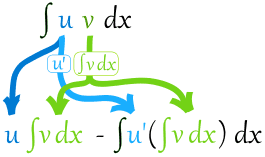 \(∫u v dx = u∫v dx −∫u' (∫v dx) dx\)