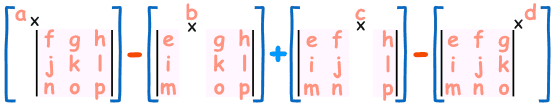 同一规律也适用于 4×4 矩阵:- 加:a 乘以 不在 a 的行或列 的矩阵 的行列式,