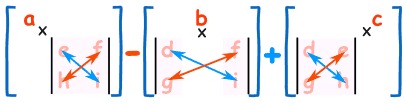 \(A= \begin{pmatrix} a & b & c \\ d & e & f \\ g & h & i \\ \end{pmatrix}\quad\quad\quad|A| = a(ei - fh) - b(di - fg) + c(dh - eg) \)
