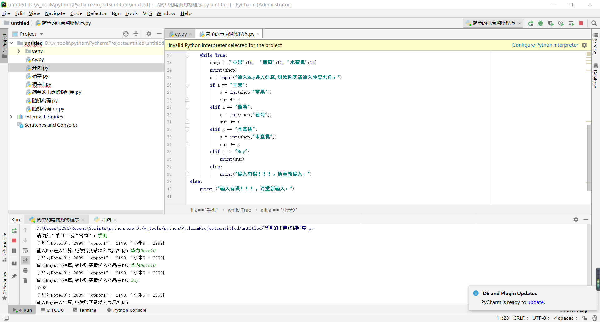 sum=0 a=input("请输入“手机”或“食物”:") if a=="手机": while True: shop = { '华为Note10':2899, 'oppor17':2199, '小米9':2999} print(shop) a = input("输入Buy进入结算,继续购买请输入物品名称:") if a == "华为Note10": a = int(shop["华为Note10"]) sum += a elif a == "oppor17": a = int(shop["oppor17"]) sum += a elif a == "小米9": a = int(shop["小米9"]) sum += a elif a == "Buy": print(sum) else: print("输入有误!!!,请重新输入:") elif a=="食物": while True: shop = {'苹果':15, '葡萄':12, '水蜜桃':14} print(shop) a = input("输入Buy进入结算,继续购买请输入物品名称:") if a == "苹果": a = int(shop["苹果"]) sum += a elif a == "葡萄": a = int(shop["葡萄"]) sum += a elif a == "水蜜桃": a = int(shop["水蜜桃"]) sum += a elif a == "Buy": print(sum) else: print("输入有误!!!,请重新输入:") else: print ("输入有误!!!,请重新输入:")