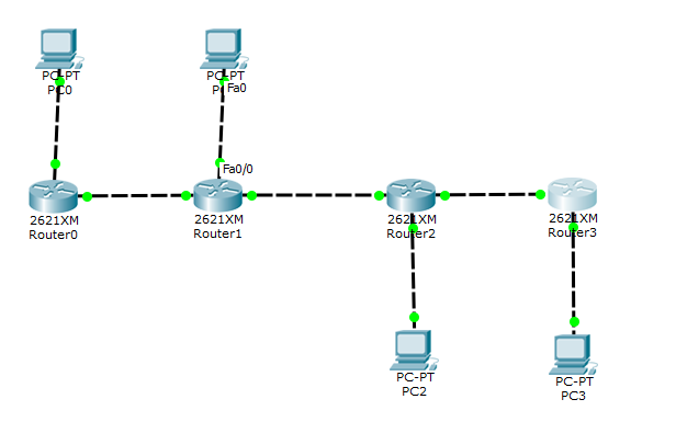 PC1与PC0连通: PC1与PC2连通: 5.测试:全网贯通么?结论:网络贯通。 ――截图(测试至少2个图、查看R1/R2/R3/R4的路由表1个图) R1: R2: R3: R4: P0到P3连通: PC0到PC2连通: 6.尝试:PC1远程登录到路由器R4。 ――截图(在PC1上登录到路由器R4显示的图,并和R4路由器上看到的图对比。) 设置密码: 对比:
