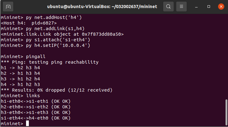 3.在2 b)的基础上,在Mininet交互界面上新增1台主机并且连接到交换机上,再测试新拓扑的连通性。