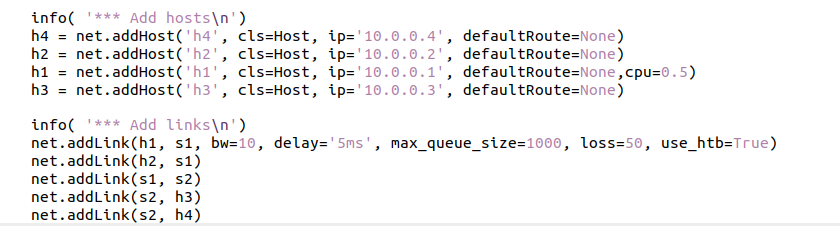 b) h1和s1之间的链路带宽为10,延迟为5ms,最大队列大小为1000,损耗率50。